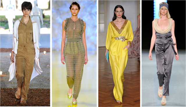 Os macacões da Primavera Verão 2011/2012 vão muito além da praticidade que essas peças possuem: são verdadeiros objetos de desejo fashion, com silhuetas esvoaçantes, grandes quantidade de tecido, e uma infinidade de formas e comprimentos. Os modelos com decote tomara-que-caia prometem ser os queridinhos das mulheres mais descoladas, enquanto os com decote em V prezam toda a sensualidade da estação mais quente do ano.